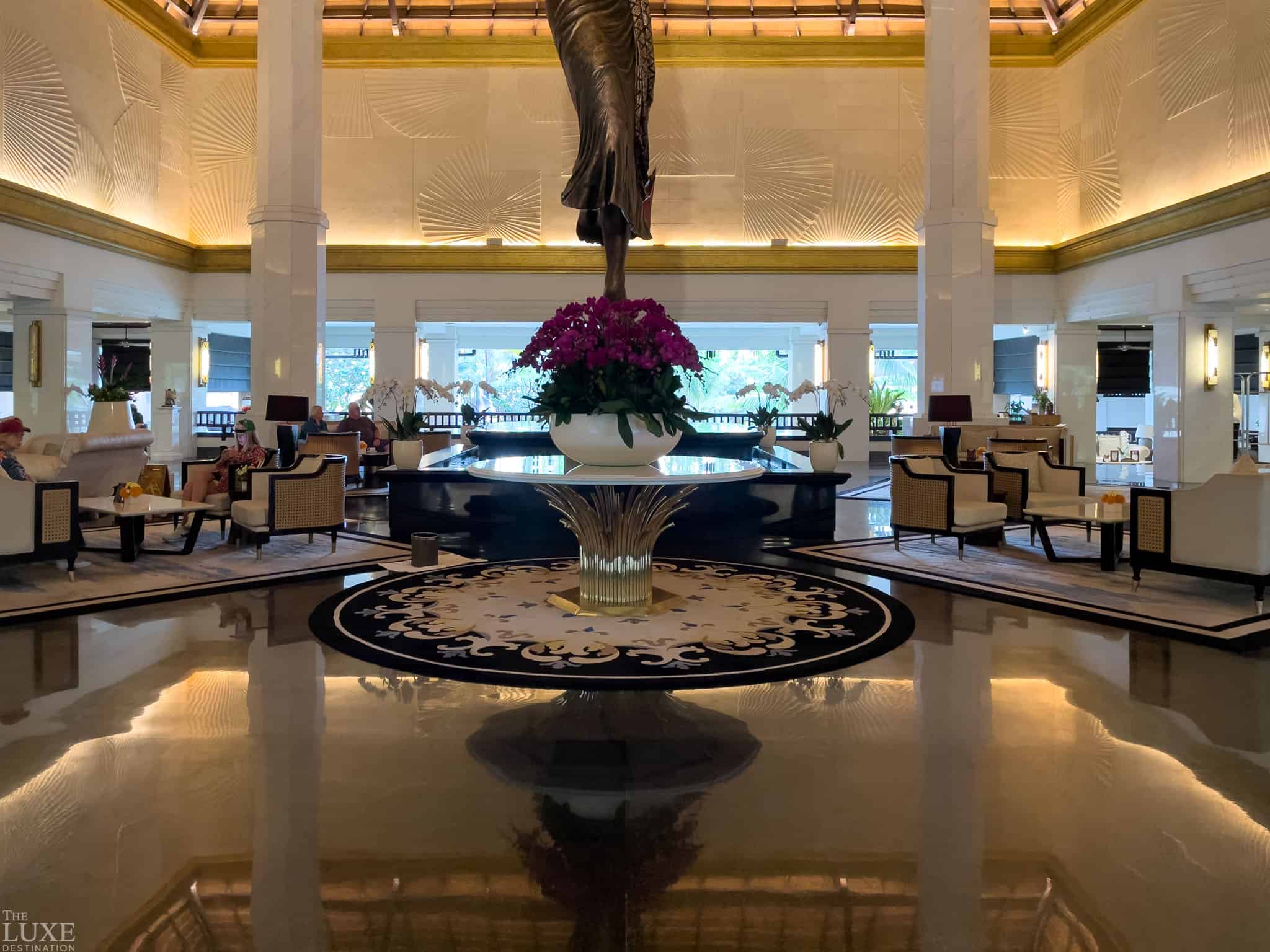 Stepping into the arrival corridor of the InterContinental Bali Resort immediately establishes a sense of place. Large white vases filled with vibrant tropical greenery line the grand, open-air walkway, while the high vaulted wooden ceilings and traditional Balinese architectural details promise a stay of refined cultural eleganceStepping into the main lobby, you are greeted by an expansive, light-filled space that perfectly balances modern luxury with traditional Balinese artistry. From the soaring ceilings and intricate wall carvings to the vibrant floral centerpieces, every detail invites you to slow down and soak in the tropical eleganceDeepening the cultural immersion, the lobby features a striking collection of traditional Balinese art. Intricately carved, golden-winged statues stand guard over a polished stone stairway, leading the eye toward the “The Bar” and more intimate lounge spaces beyondLive piano music often fills the lobby, adding a sophisticated, serene soundtrack to the afternoonThe view from the lobby balcony is the perfect first look at the resort, stretching across the lily ponds and palm trees all the way to the seaThe check-in process is a seamless introduction to the resort’s luxury. Backed by an ornate gold-leaf mural and flanked by massive white planters, the marble reception desk offers a grand yet welcoming first point of contactTucked away from the main bustle, the lobby lounge offers a serene spot to relax amongst lush garden views and elegant Balinese decor