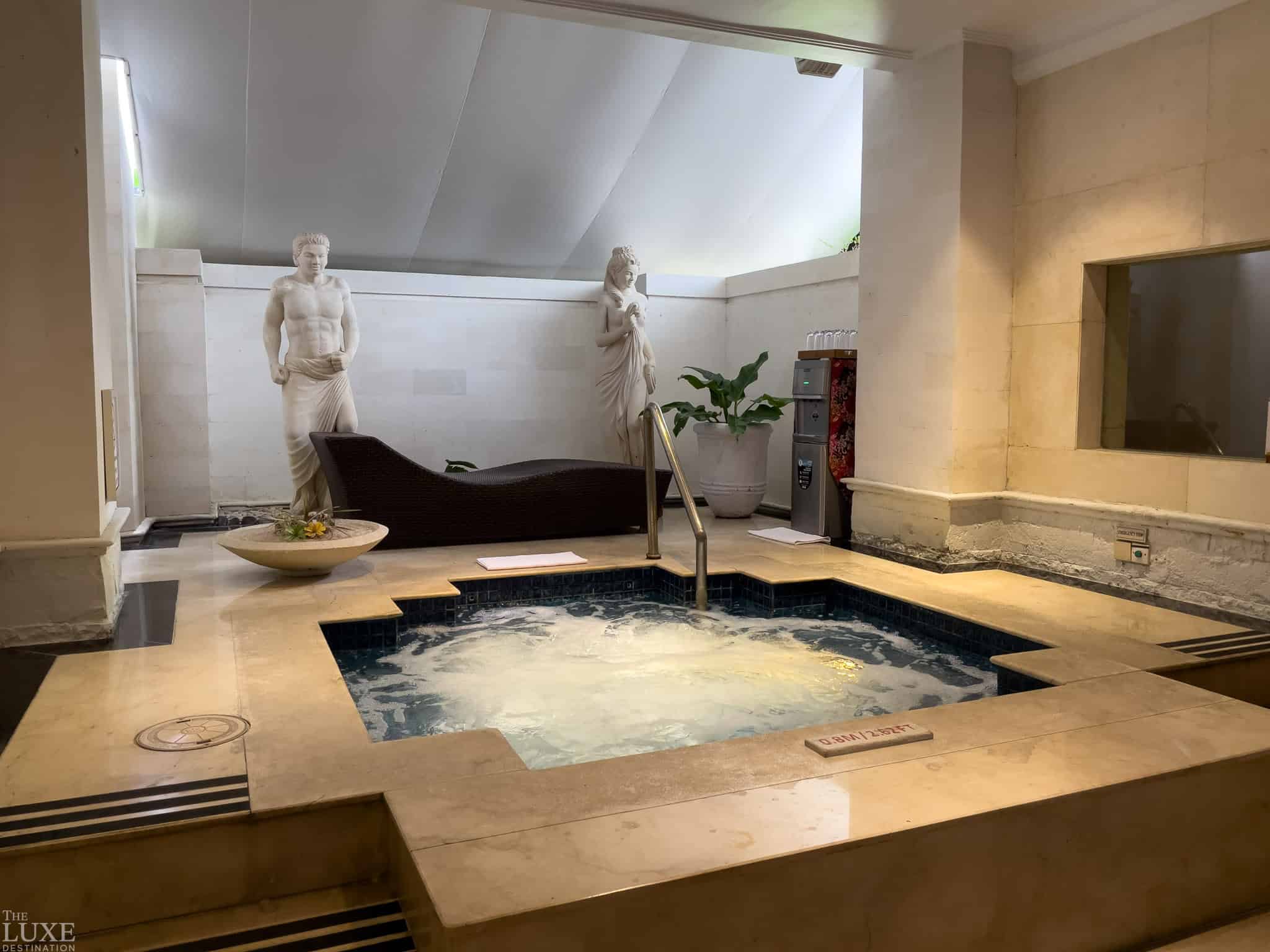 Finding tranquility at Spa Uluwatu, where the soft Bali rain transforms the resort’s lush lagoons and gardens into a peaceful, emerald sanctuaryThe reception gallery at Spa Uluwatu emphasizes a luxurious sense of space, where high ceilings and a wall-less design invite the natural beauty of Bali indoorsNestled within the expansive spa gallery is a cozy library lounge, offering a sophisticated space for guests to pause and enjoy a moment of literature-filled quietThe sense of luxury extends into the spa’s vanity room, where rich, vein-cut marble walls meet clean, modern lines for a truly grounding atmosphereBeyond the vanity lies a private hydrotherapy sanctuary, where the gentle bubbling of the jacuzzi and classical Balinese-inspired statues create an atmosphere of timeless calmA professional massage bed is dressed in warm mustard linens and a traditional Balinese patterned runner, equipped with a specialized towel warmer for maximum comfort.After the massage, the experience drifts into a final moment of calm with a warm herbal tea and a healthy seed bar served in the open-air lounge