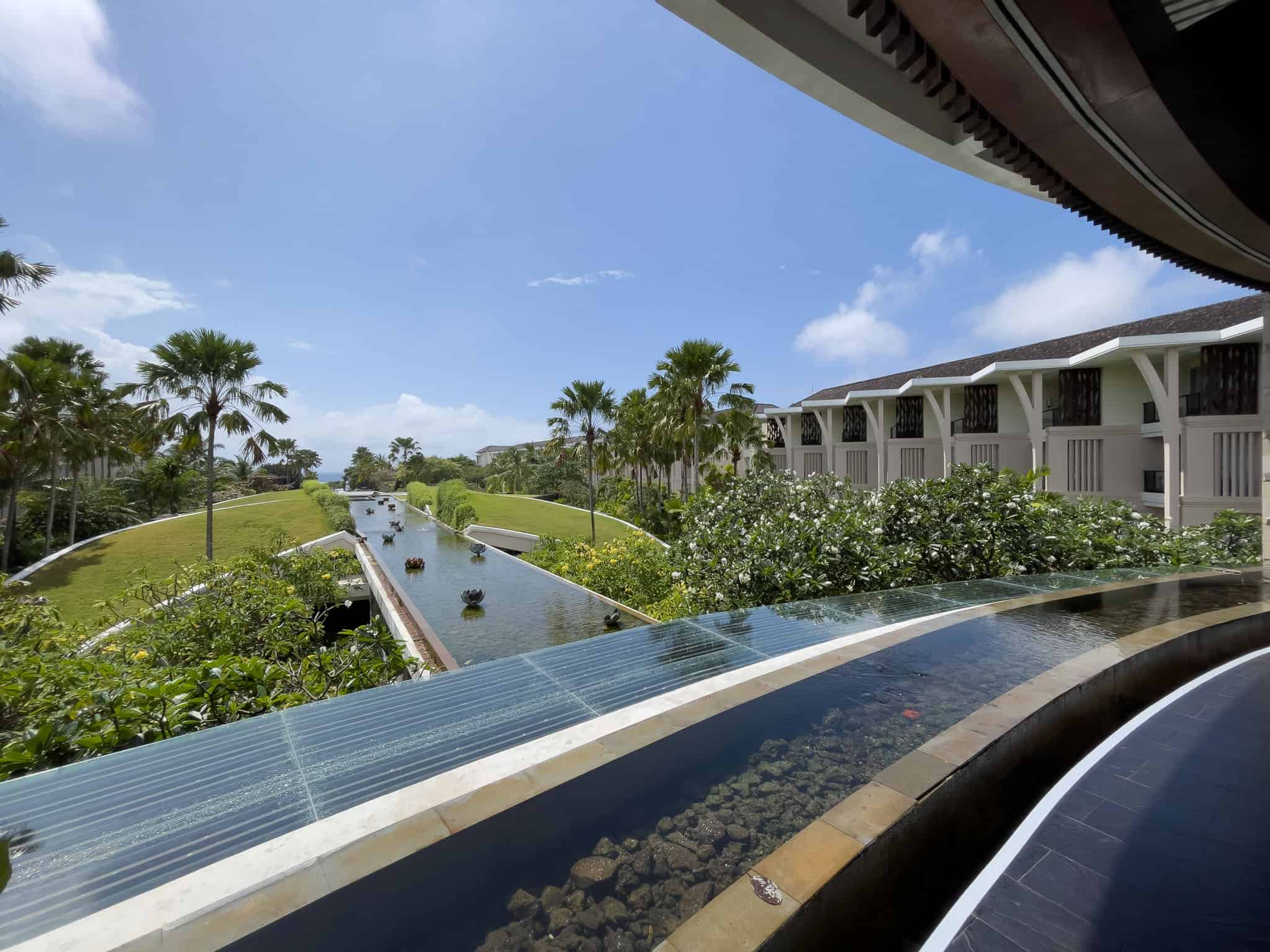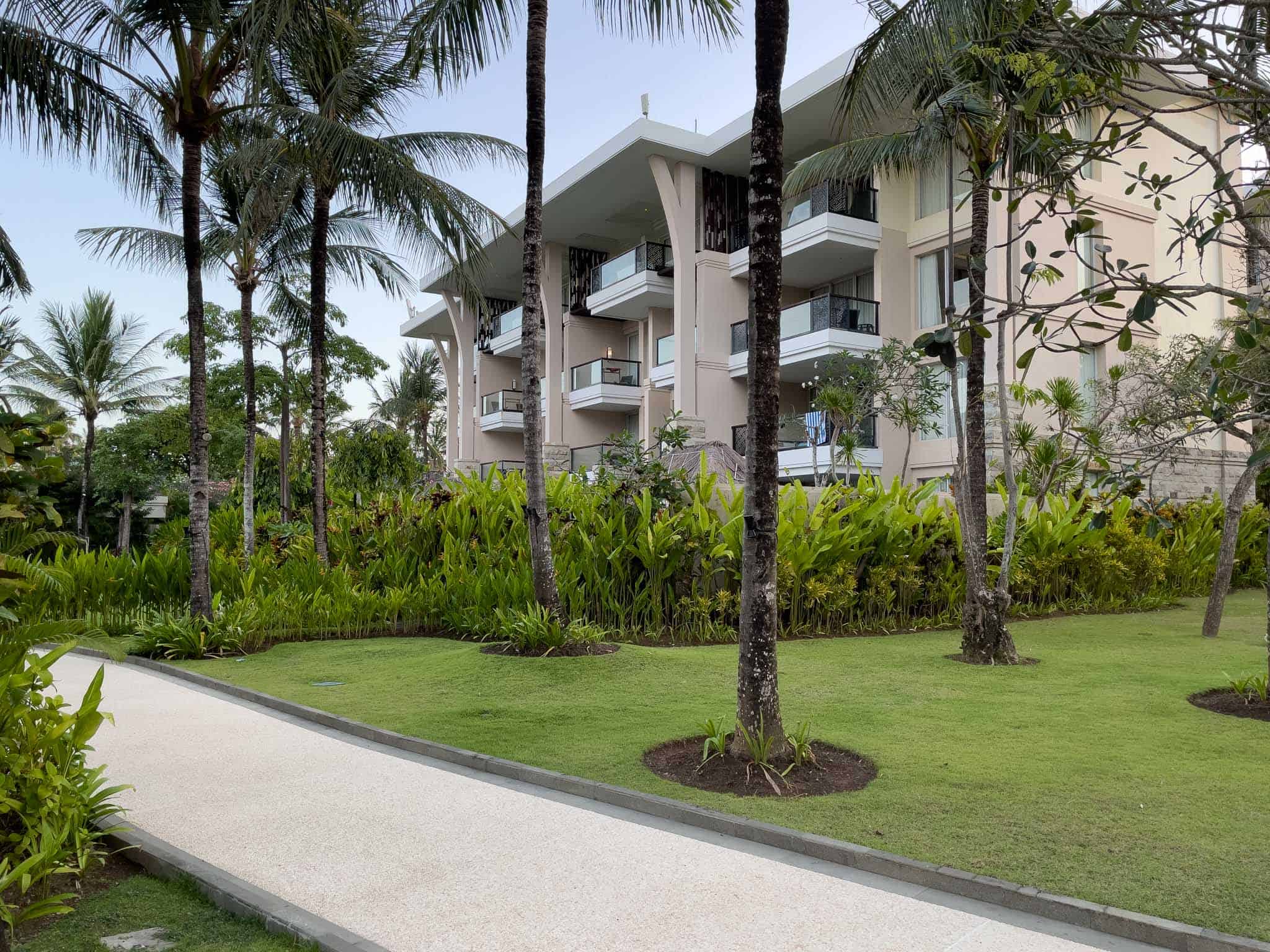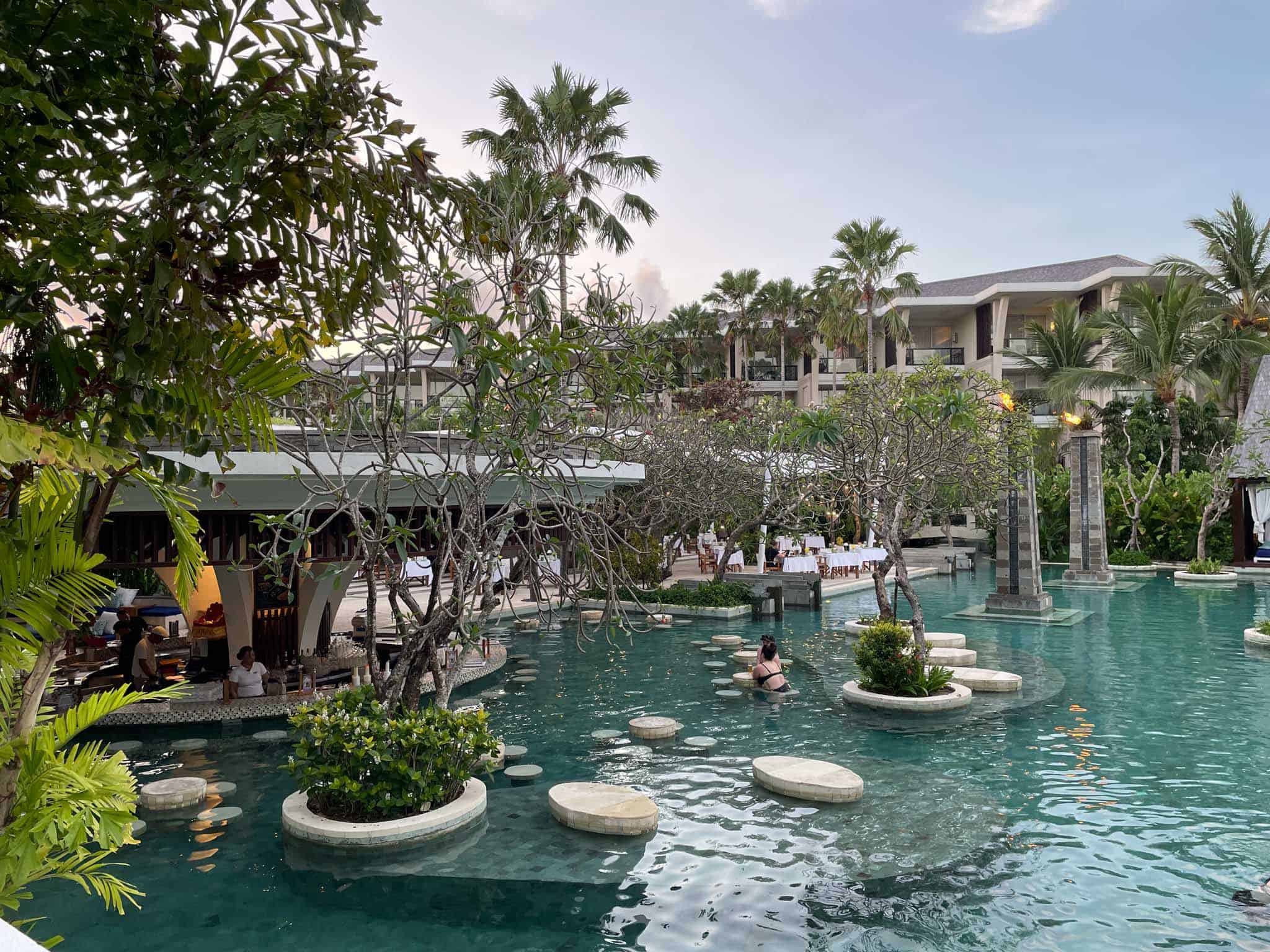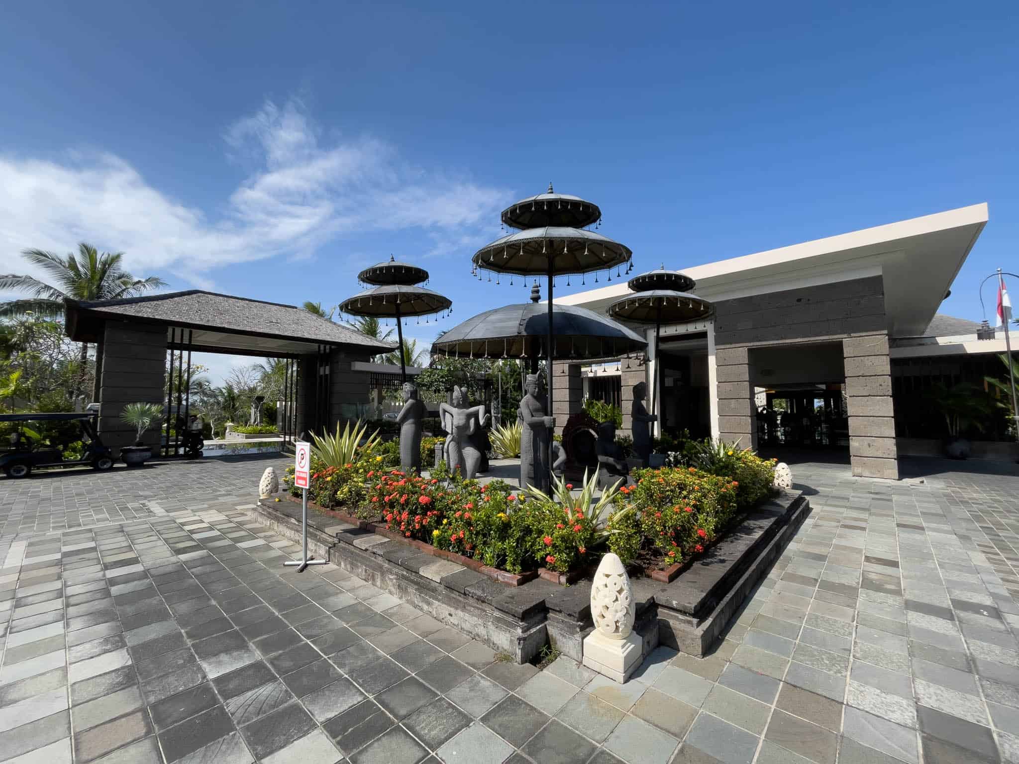 The property spans a significant area, incorporating multiple free-form swimming pools, including an interconnected lagoon pool that grants exclusive access to ground-floor rooms. Its location places it directly on the white sands of Nusa Dua Beach, offering uninterrupted sunrise views. Getting to the resort is convenient, with a journey time of approximately 20 minutes from Bali’s Ngurah Rai International Airport (DPS).