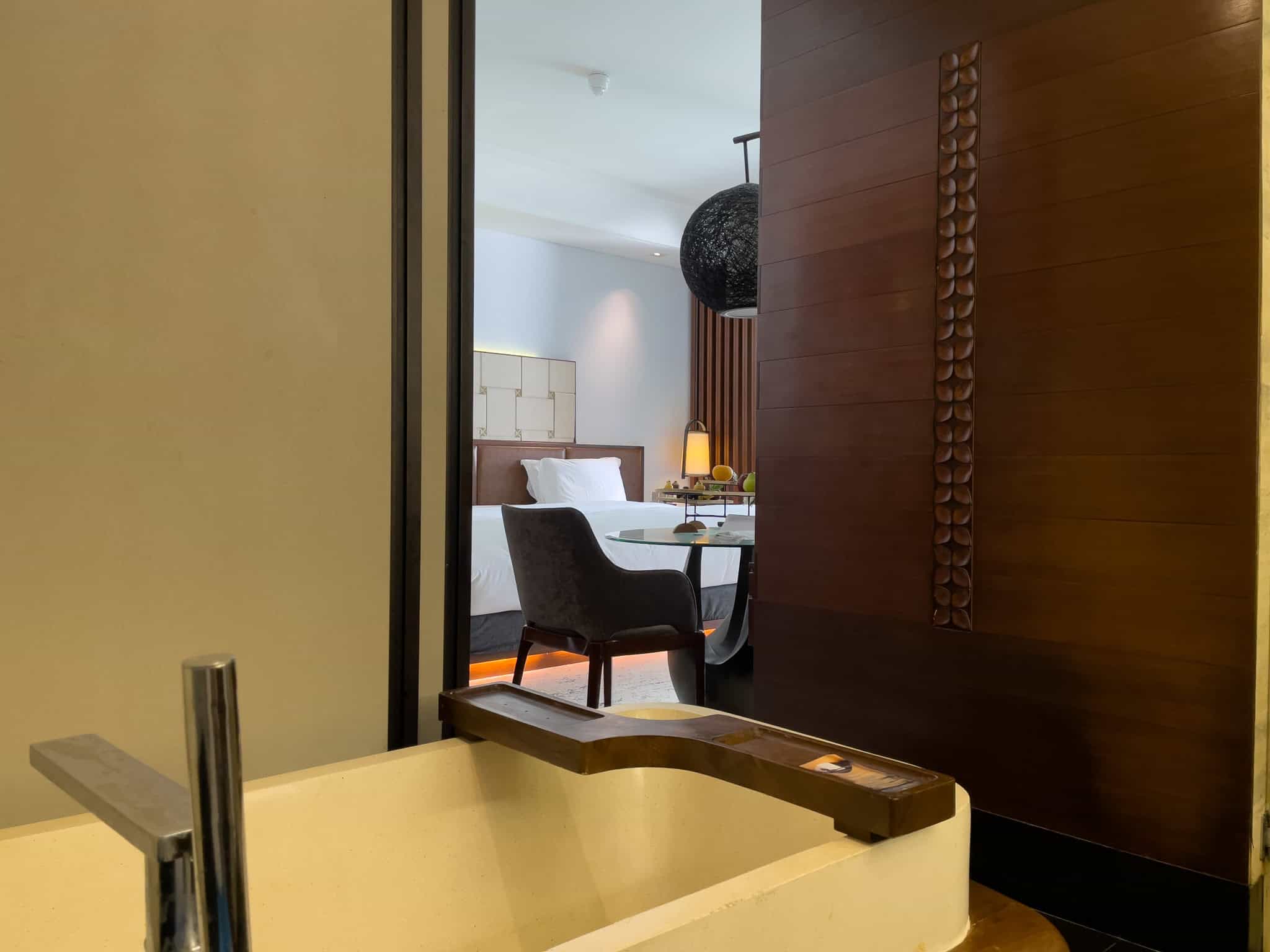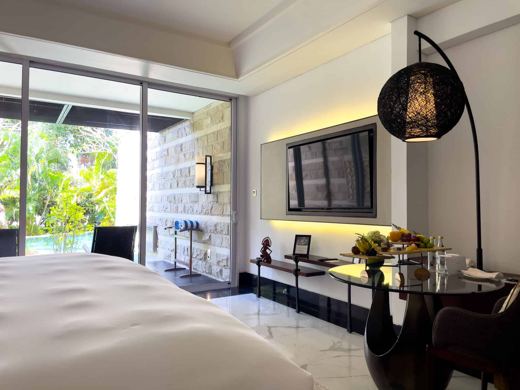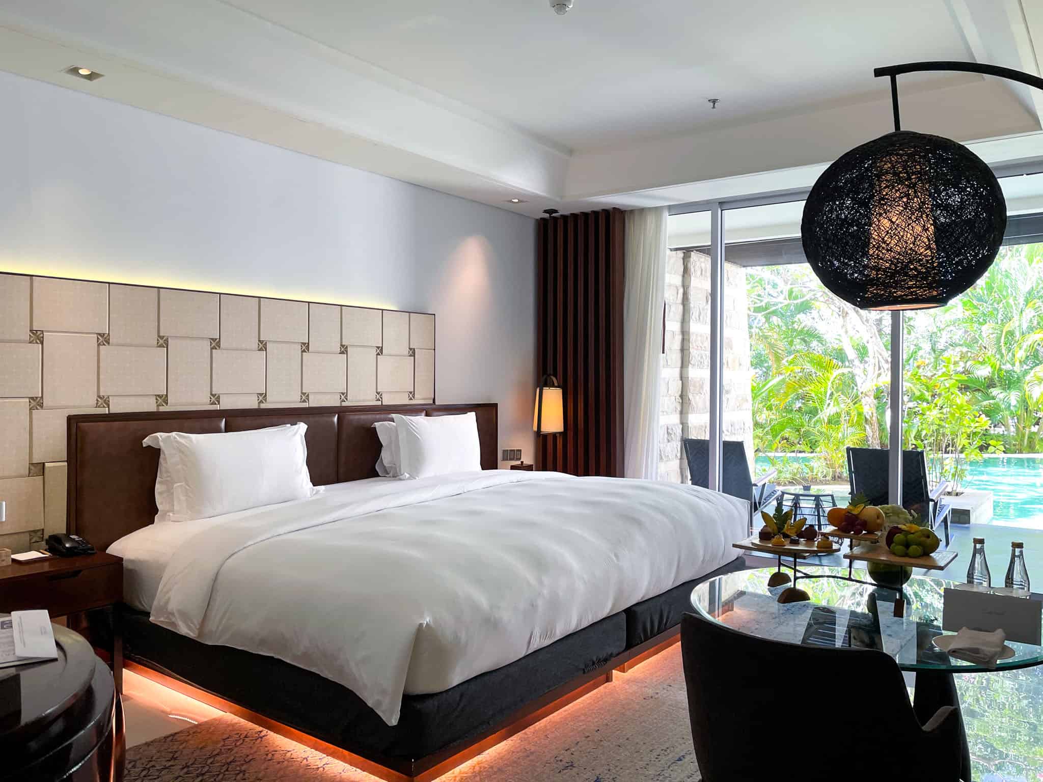 The Luxury Room Pool Access is a sought-after accommodation category, distinguished by its direct, walk-in access to the resort’s interconnected lagoon pool system. These ground-floor rooms feature a consistent design aesthetic, employing rich wood tones, dark stone, and subtle Balinese textures. The sleeping area includes a king-sized bed, typically framed by a decorative wooden headboard and complemented by integrated ambient lighting, such as the distinctive low lighting strip beneath the bed base.