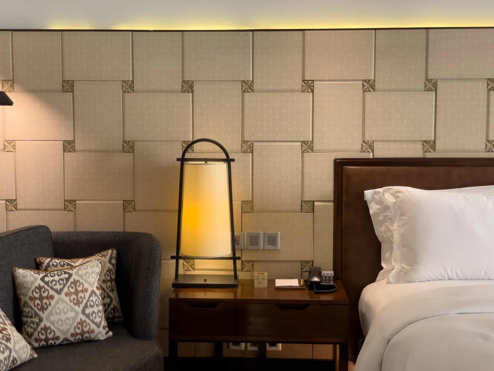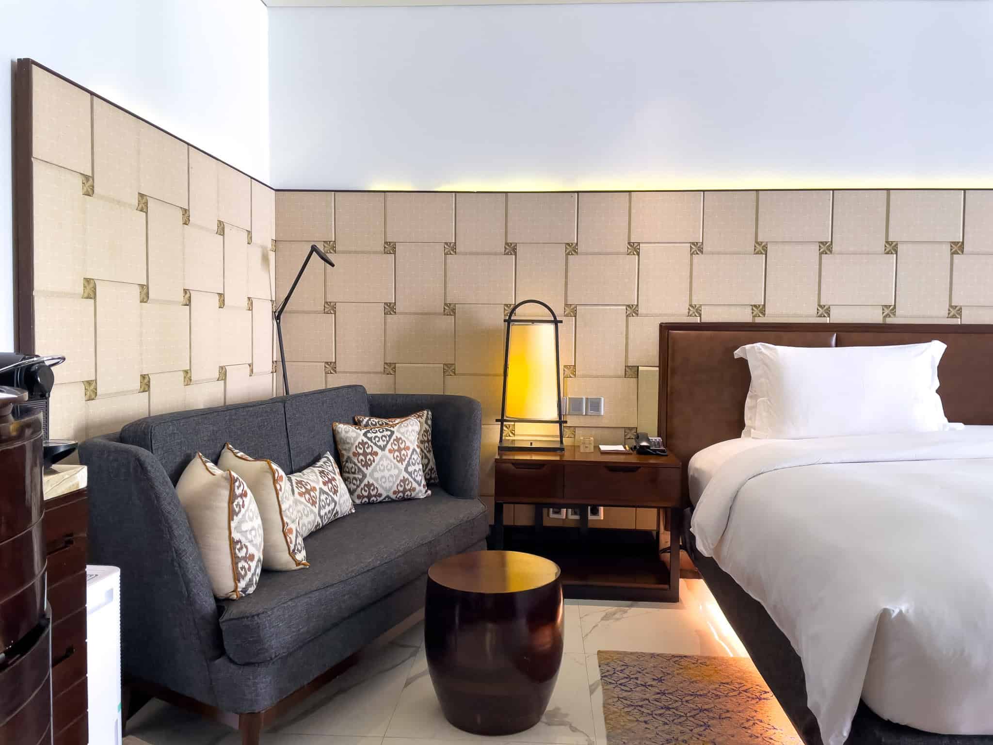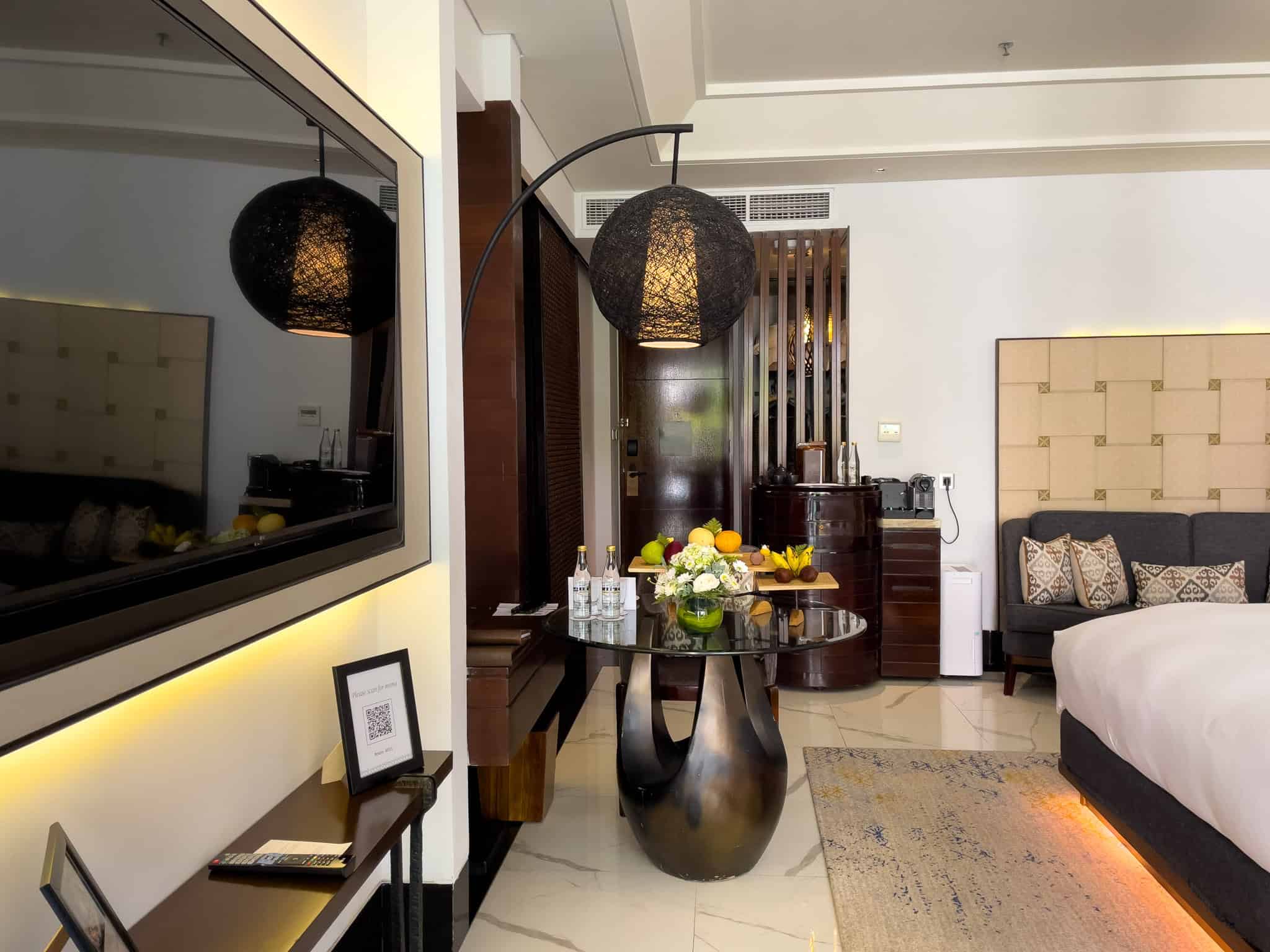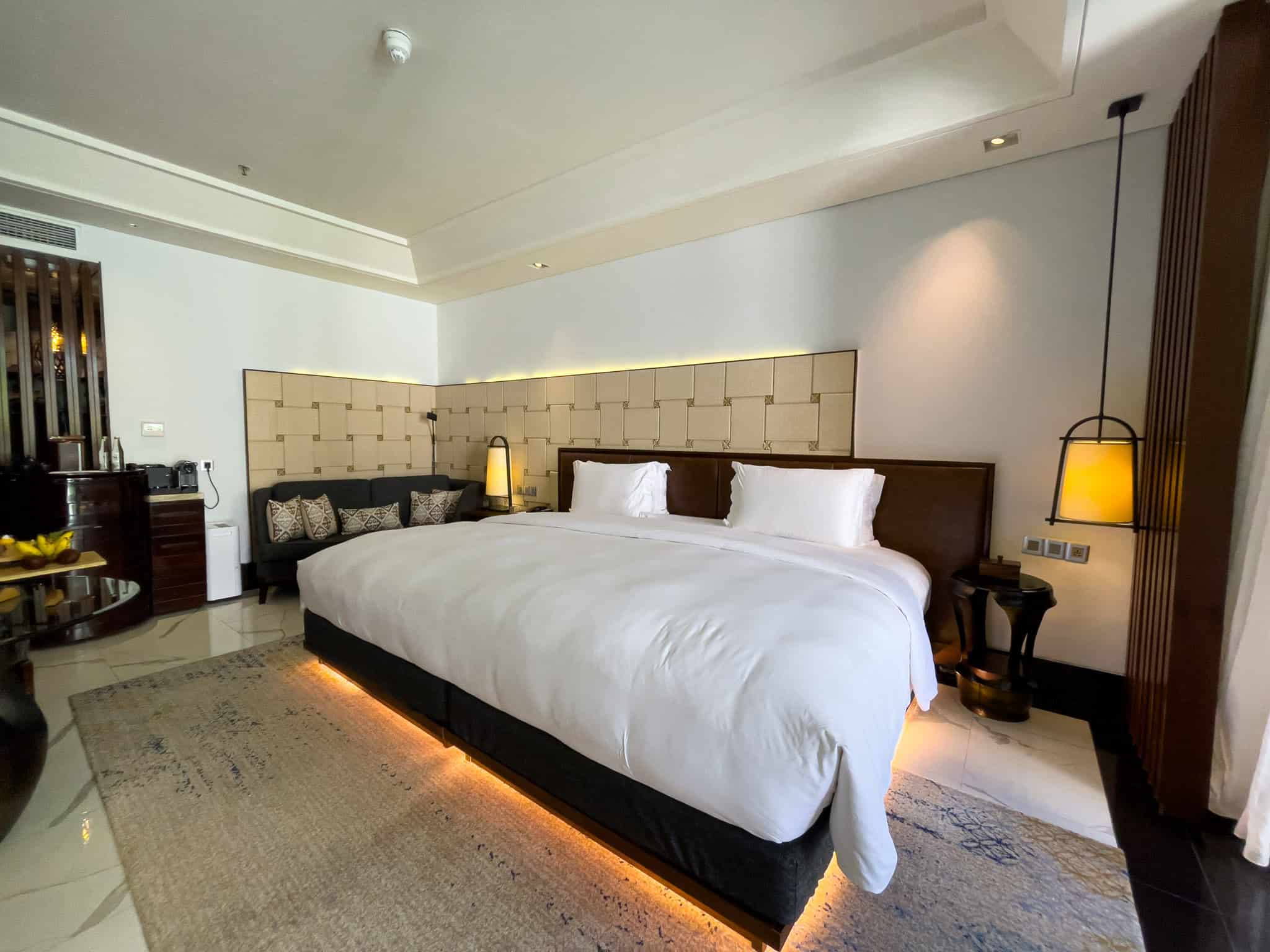 The Luxury Room Pool Access is a sought-after accommodation category, distinguished by its direct, walk-in access to the resort’s interconnected lagoon pool system. These ground-floor rooms feature a consistent design aesthetic, employing rich wood tones, dark stone, and subtle Balinese textures. The sleeping area includes a king-sized bed, typically framed by a decorative wooden headboard and complemented by integrated ambient lighting, such as the distinctive low lighting strip beneath the bed base.