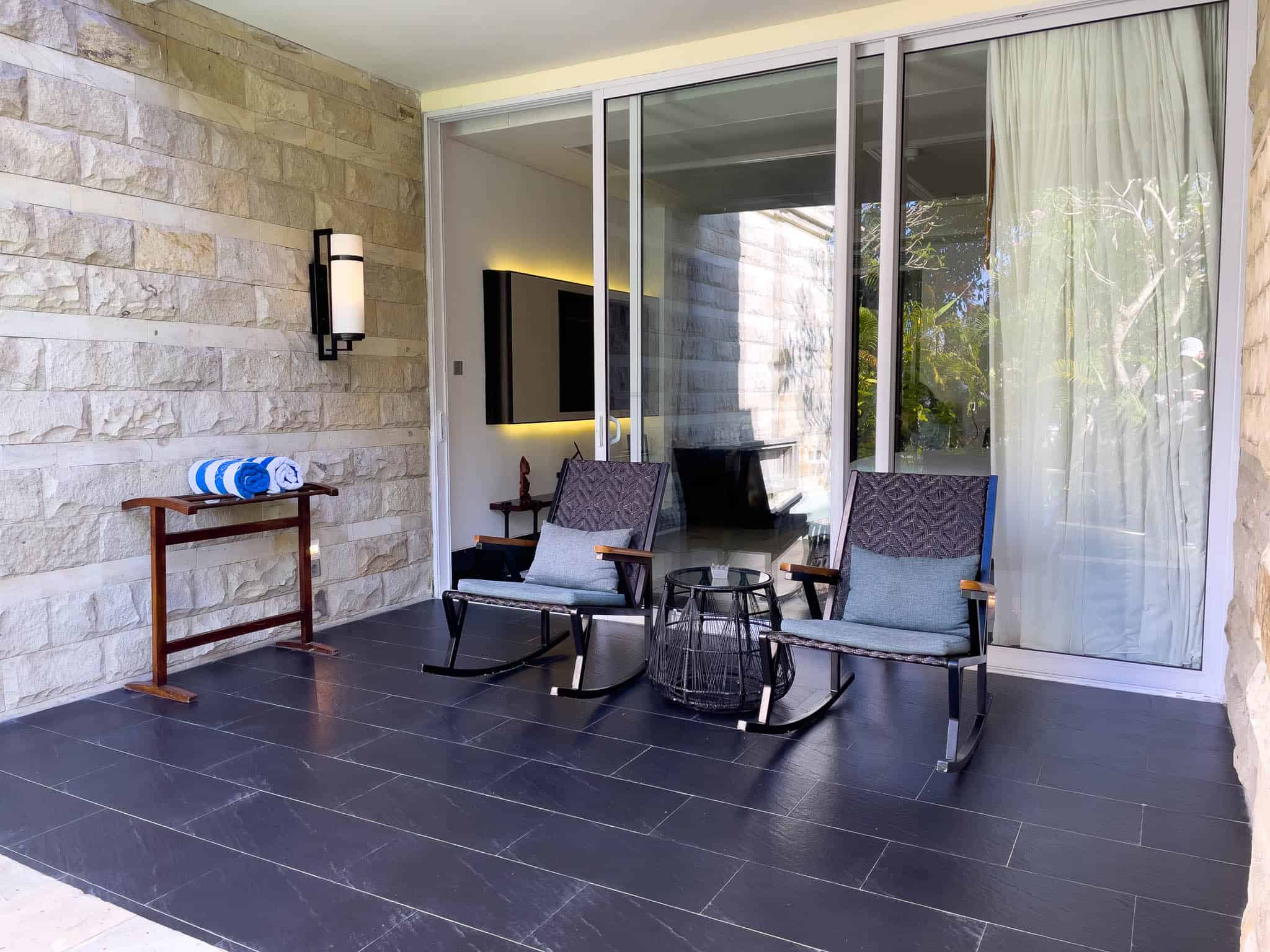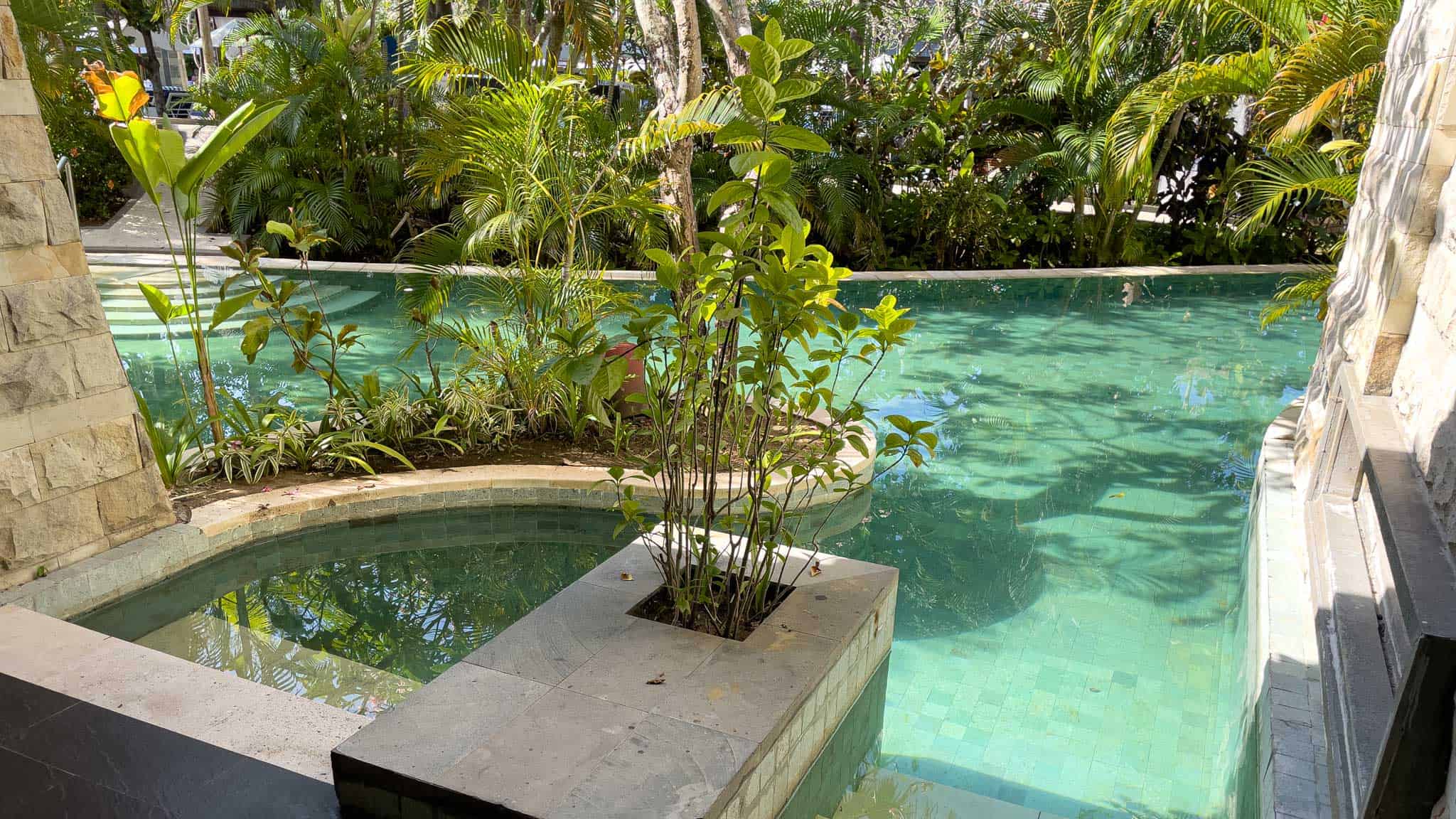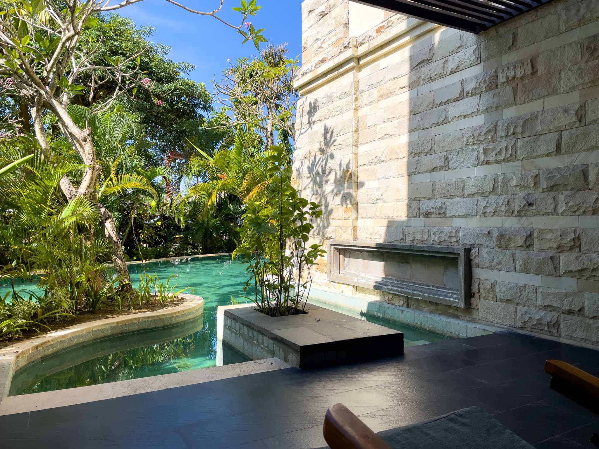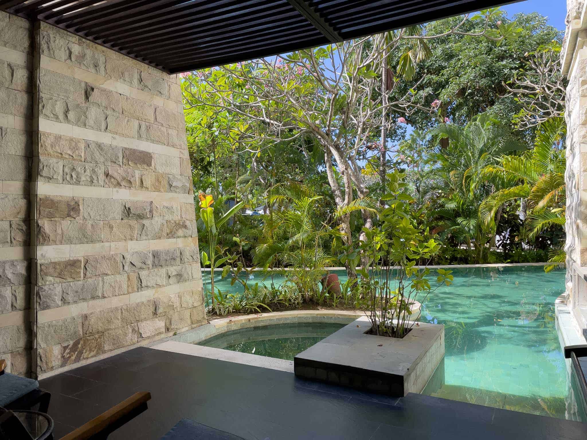The room incorporates a separate, defined sitting area and a media wall that houses a flat-screen television and a practical workspace. The standout feature is the private outdoor terrace, which is furnished with loungers and deck chairs and connects via a small set of steps directly into the water. This immediate access allows guests to transition seamlessly from their room to the pool without using main pathways. The bathrooms are finished in marble,offering a separate deep soaking tub and a walk-in shower with dual fixtures.