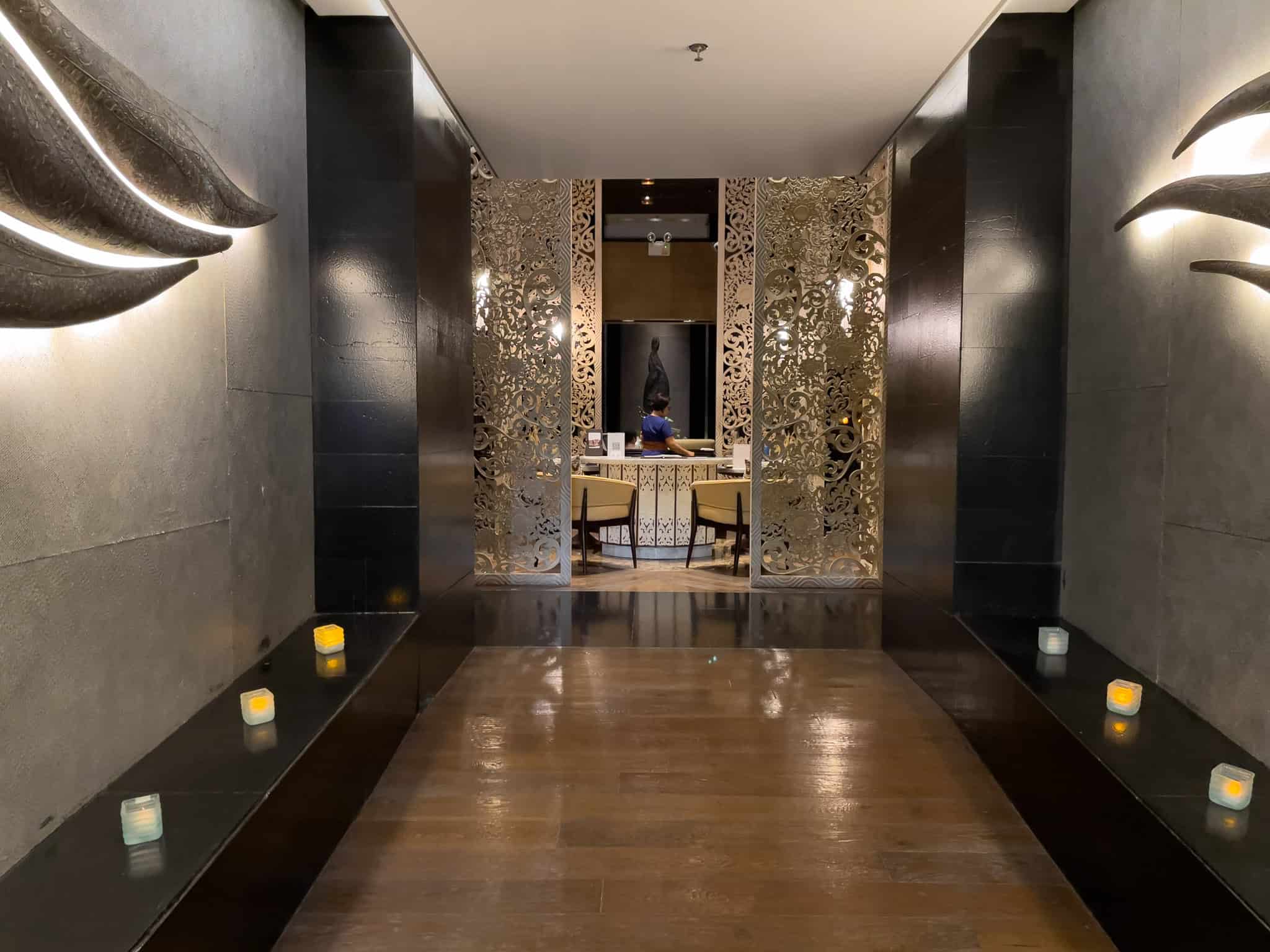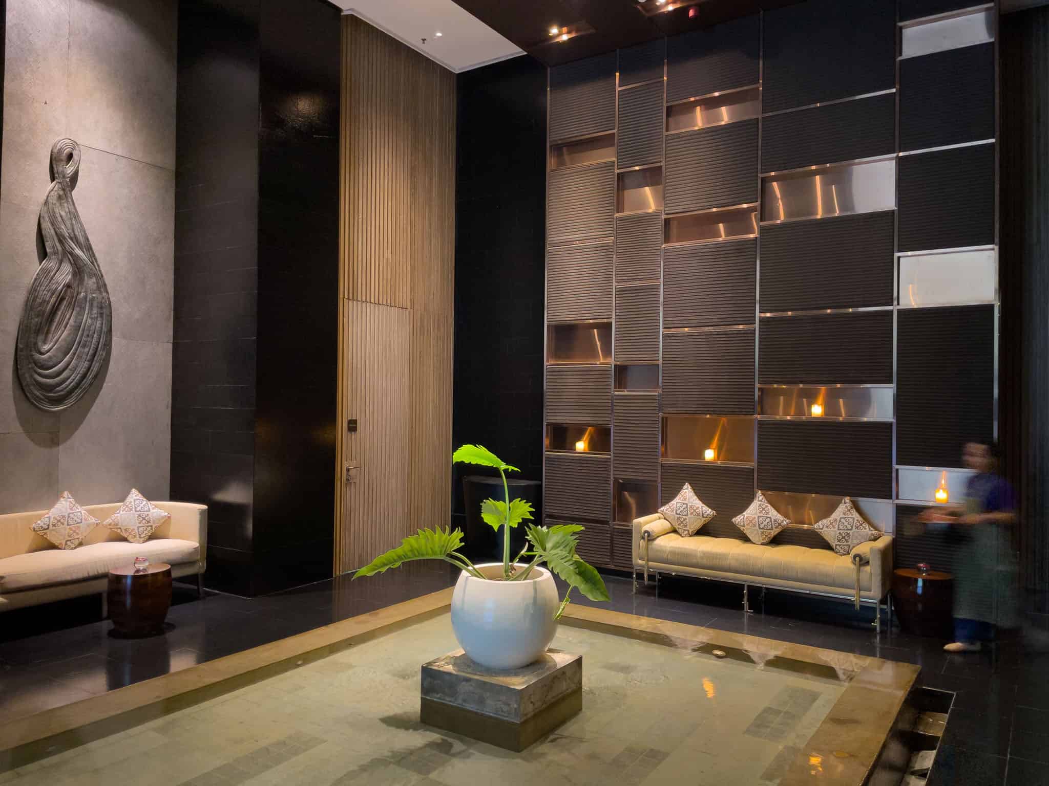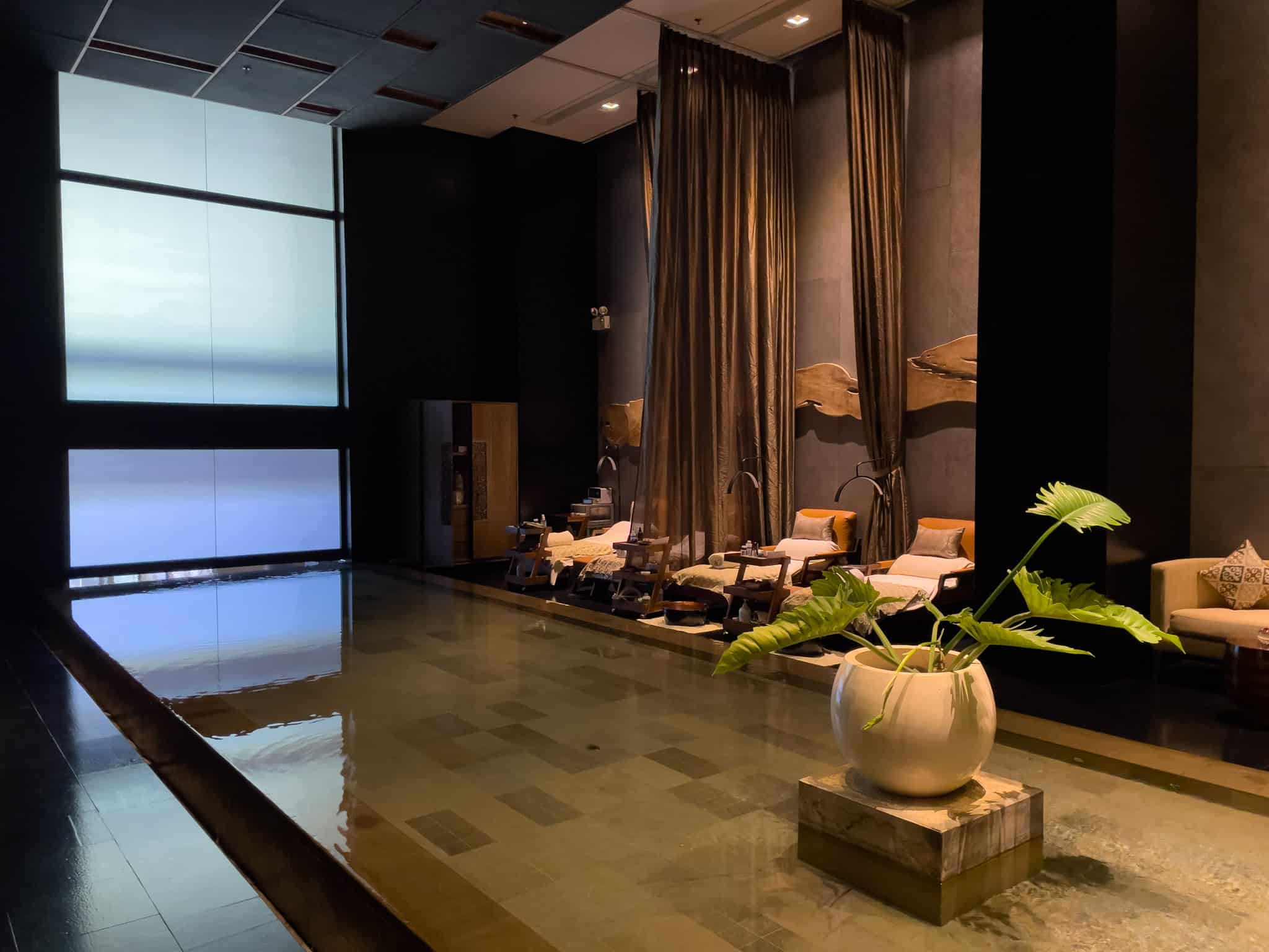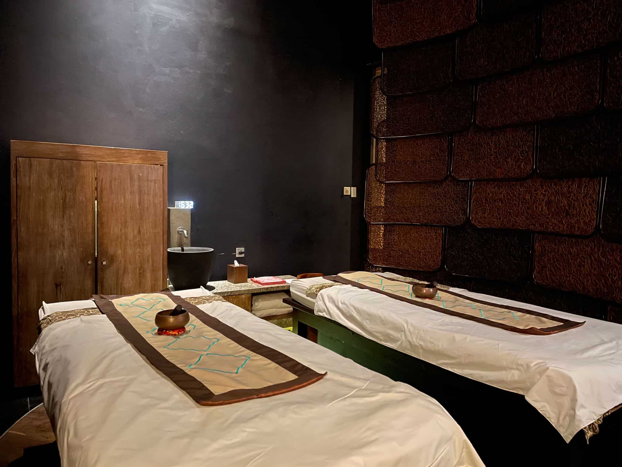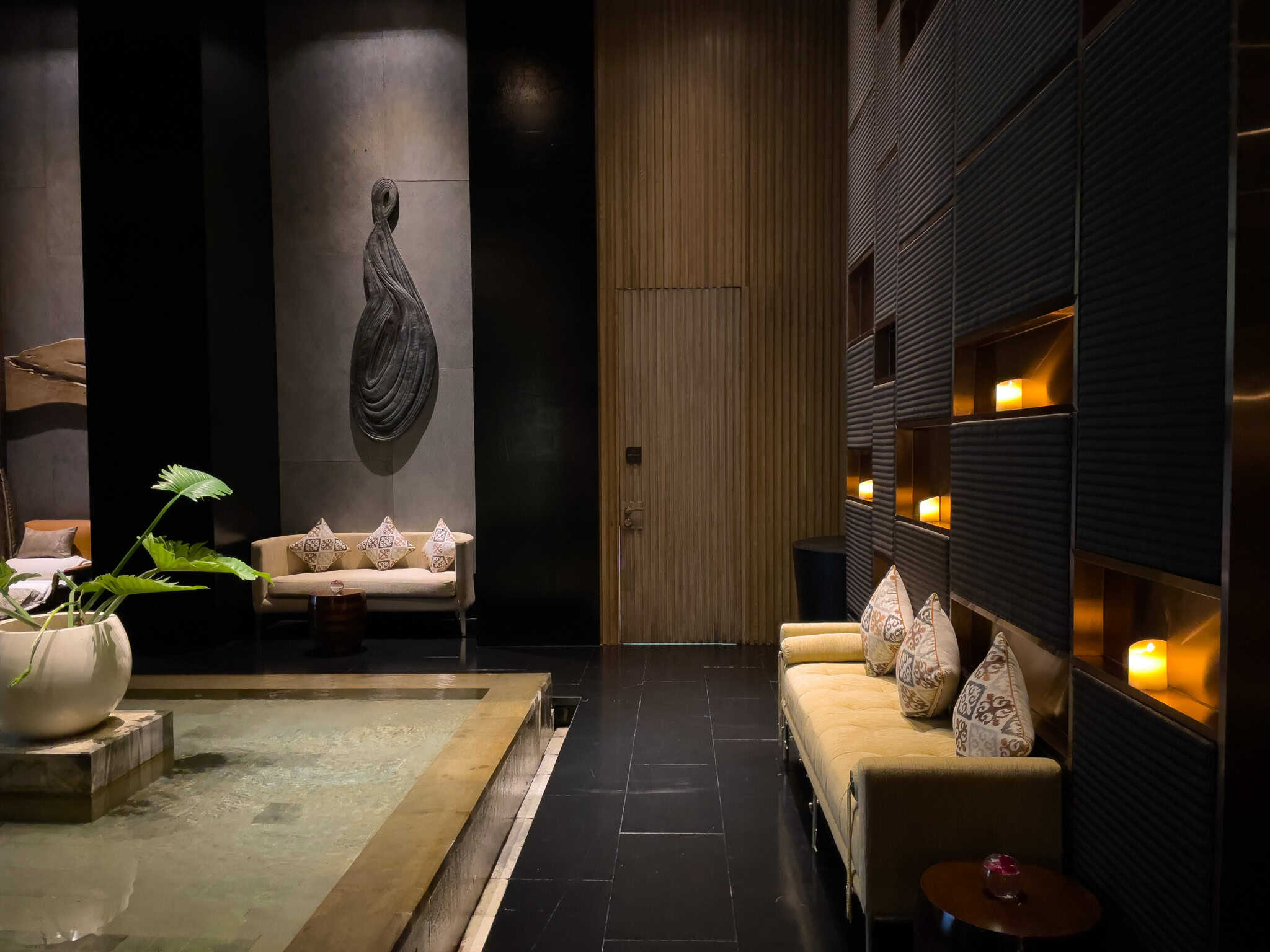 The Sofitel SPA is designed as a tranquil escape, employing a sleek, modern aesthetic with dark wood, textured stone, and atmospheric lighting to promote a sense of calm. The facility encompasses various dedicated treatment rooms, including spacious areas equipped for couple’s massages.