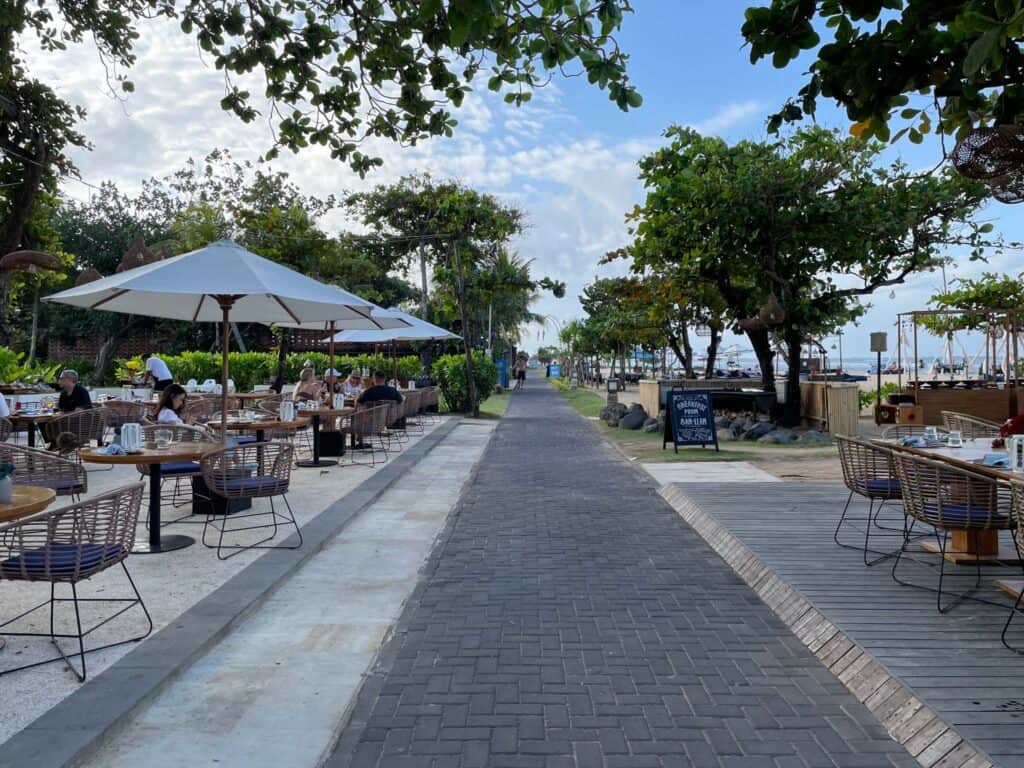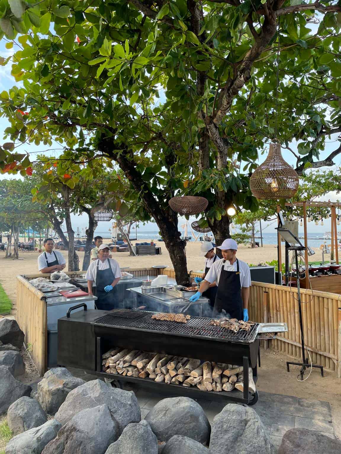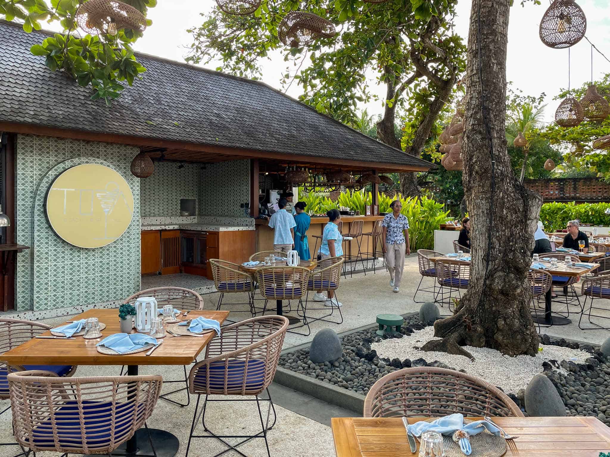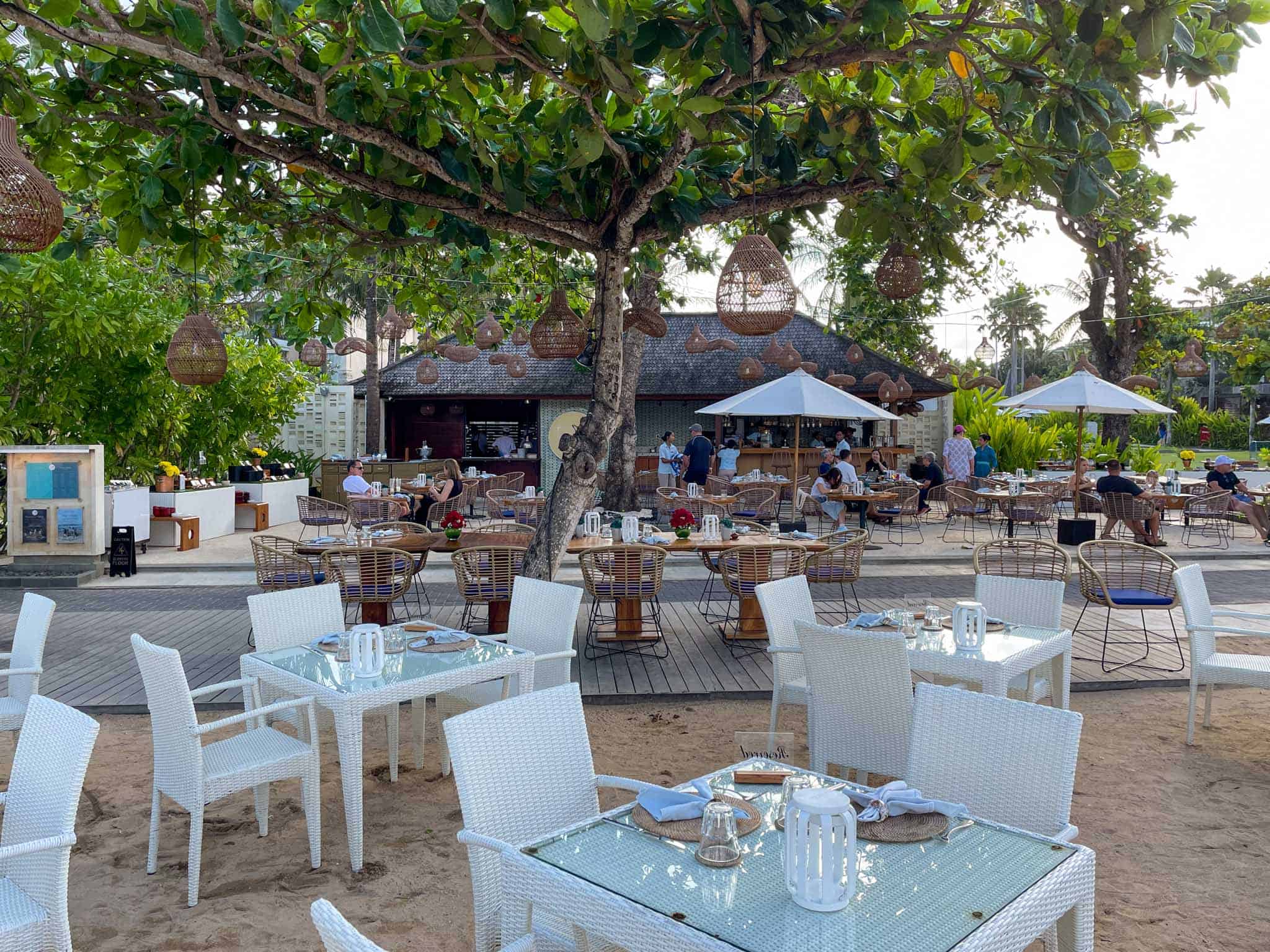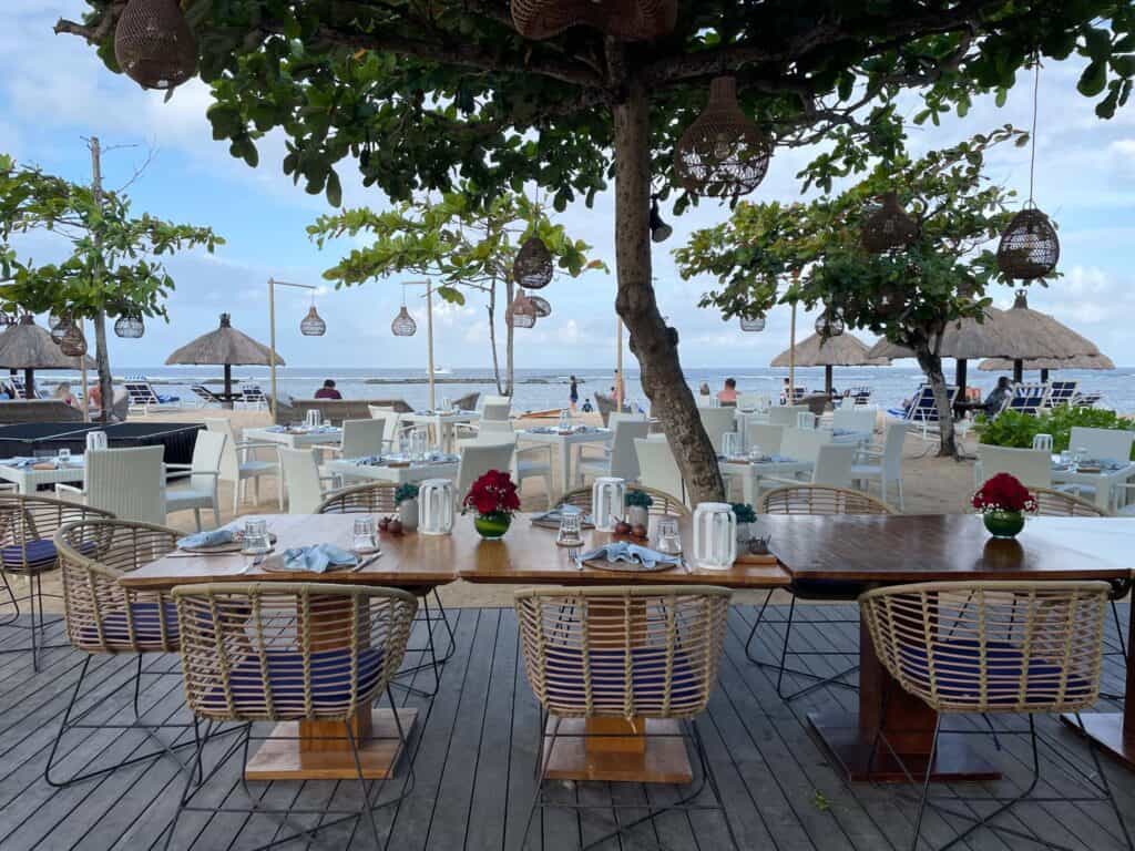 Toya Beach Bar & Grill is situated directly on the white sands of Nusa Dua Beach, establishing itself as the resort’s primary destination for casual, open-air dining by the ocean. The venue’s location is highly desirable, offering uninterrupted views of the water and the surrounding palm-lined coast, particularly appealing during the late afternoon hours. The atmosphere at Toya is intentionally set to be relaxed and sophisticated, using natural materials and shaded seating to provide a comfortable environment that contrasts with the formality of the main restaurants.